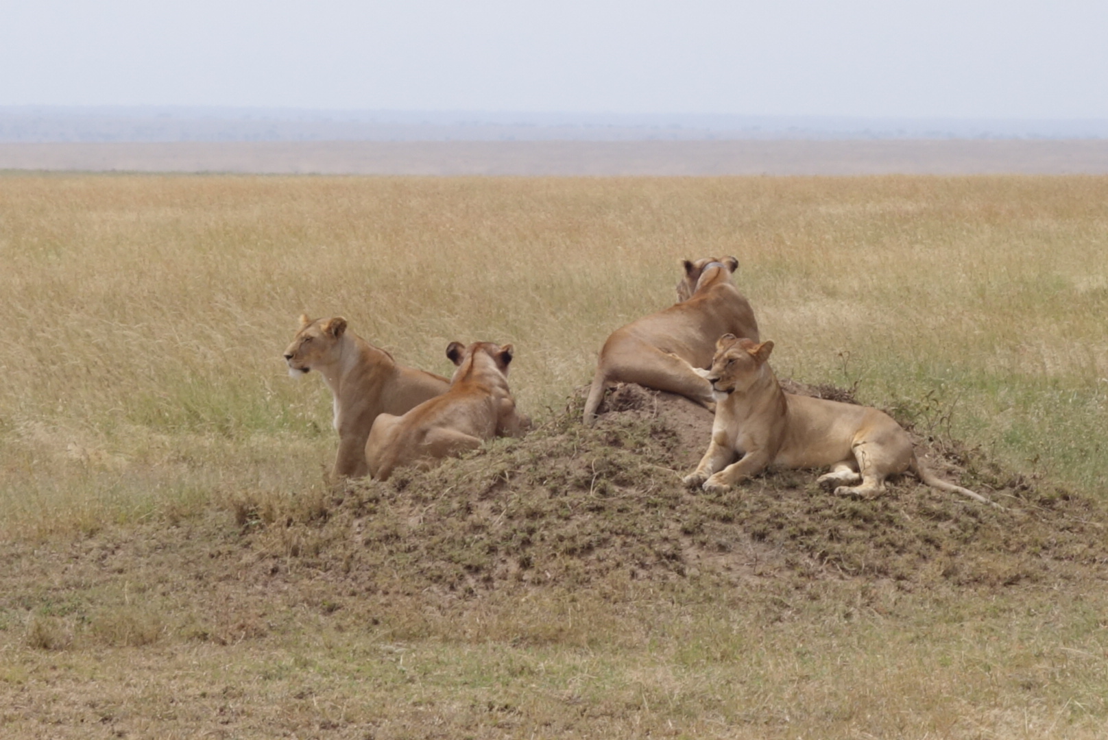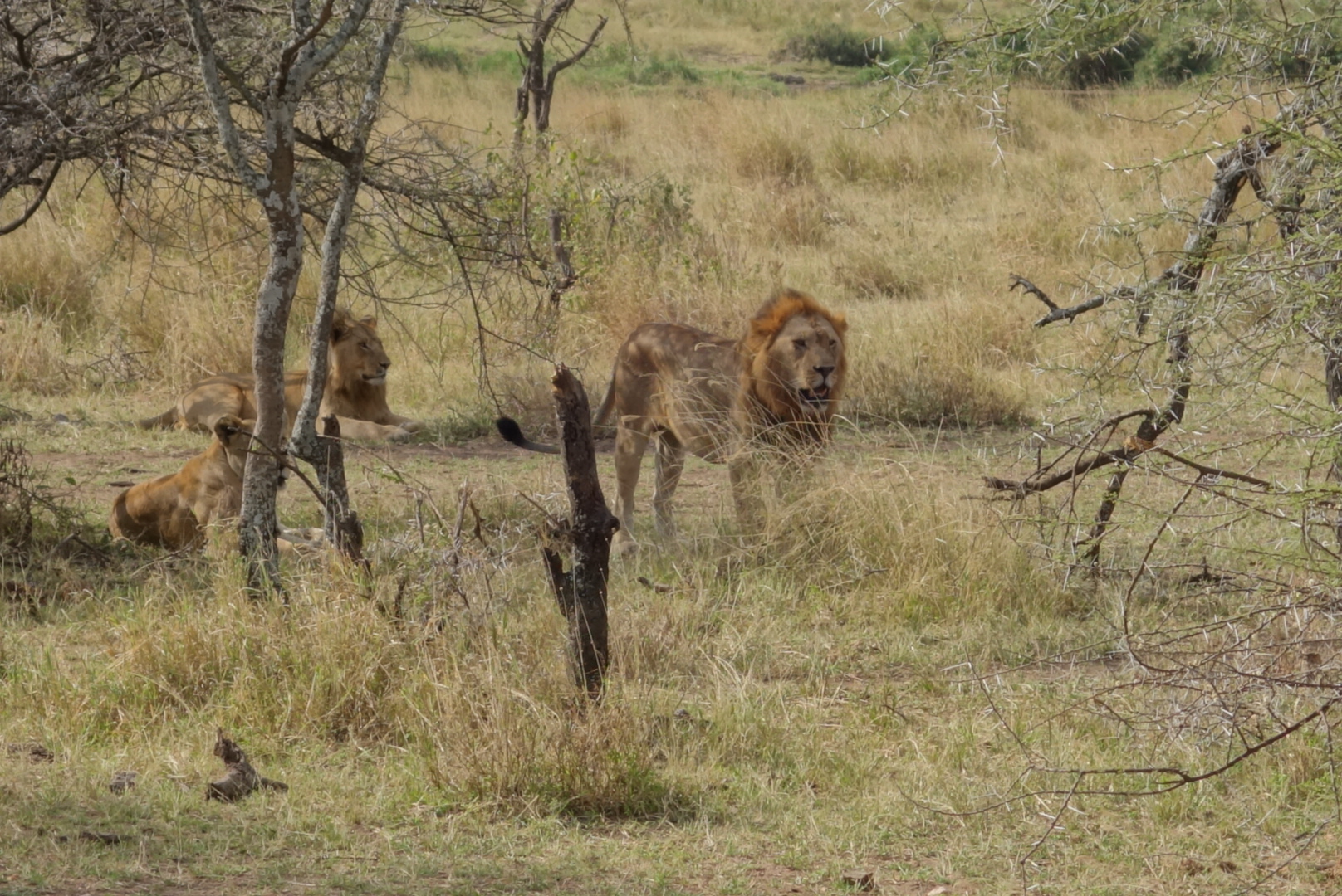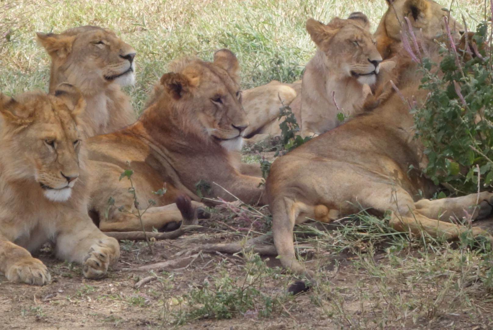 Lions are very sleepy. It’s amazing now much they remind you of house cats. I mean, my cats look like these lions 80% of the time. We saw in the neighborhood of 35 lions, and most were on the final day in the Serengeti when we saw at least 3 prides. The huge male that you can see standing facing left came from the distance, crossed the pond, went right up to our car, paused, and then walked on. We all got silent. Needless to say the windows and doors were shut tight. They can go 4-5 days between meals. They like trees, dirt hills, and shade. All great places to sleep as you can see.